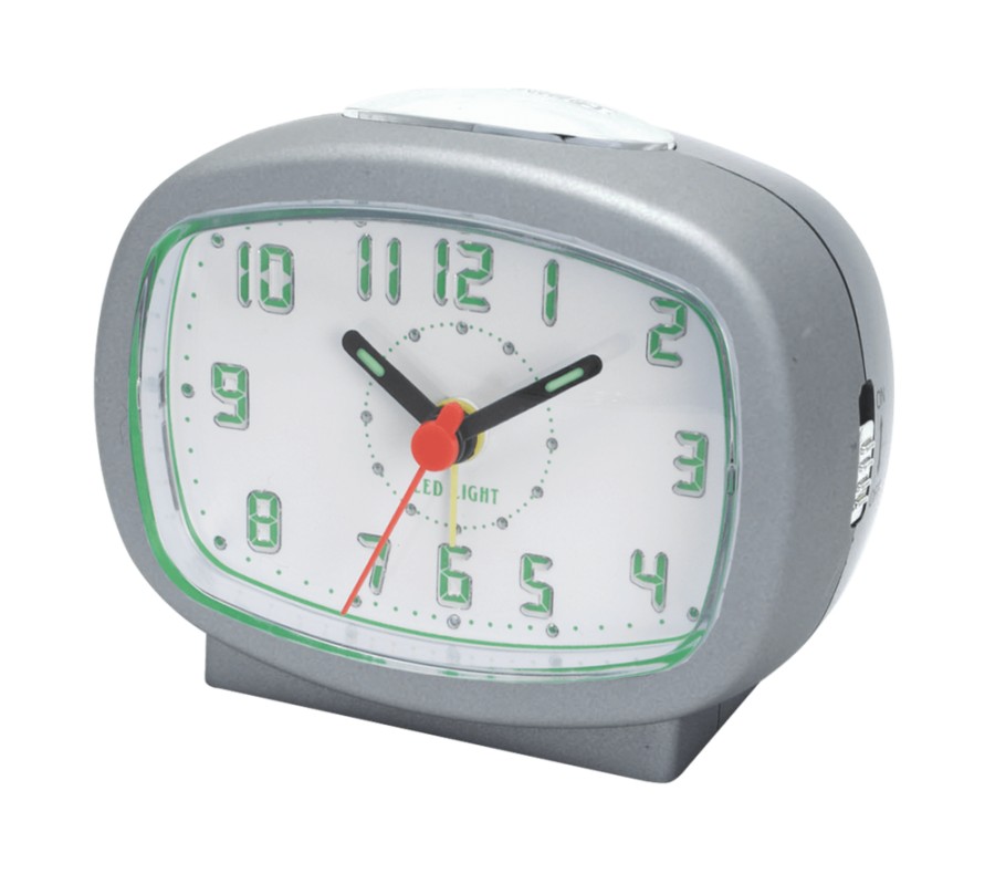 Klasický budík JVD s plynulým chodem vteřinovky a LED podsvícením číselníku potěší a uspokojí i ty nejnáročnější zákazníky. Jeho výhodou je také odložení buzení. <br><br>- šedá barva<br>- zelené LED podsvícení