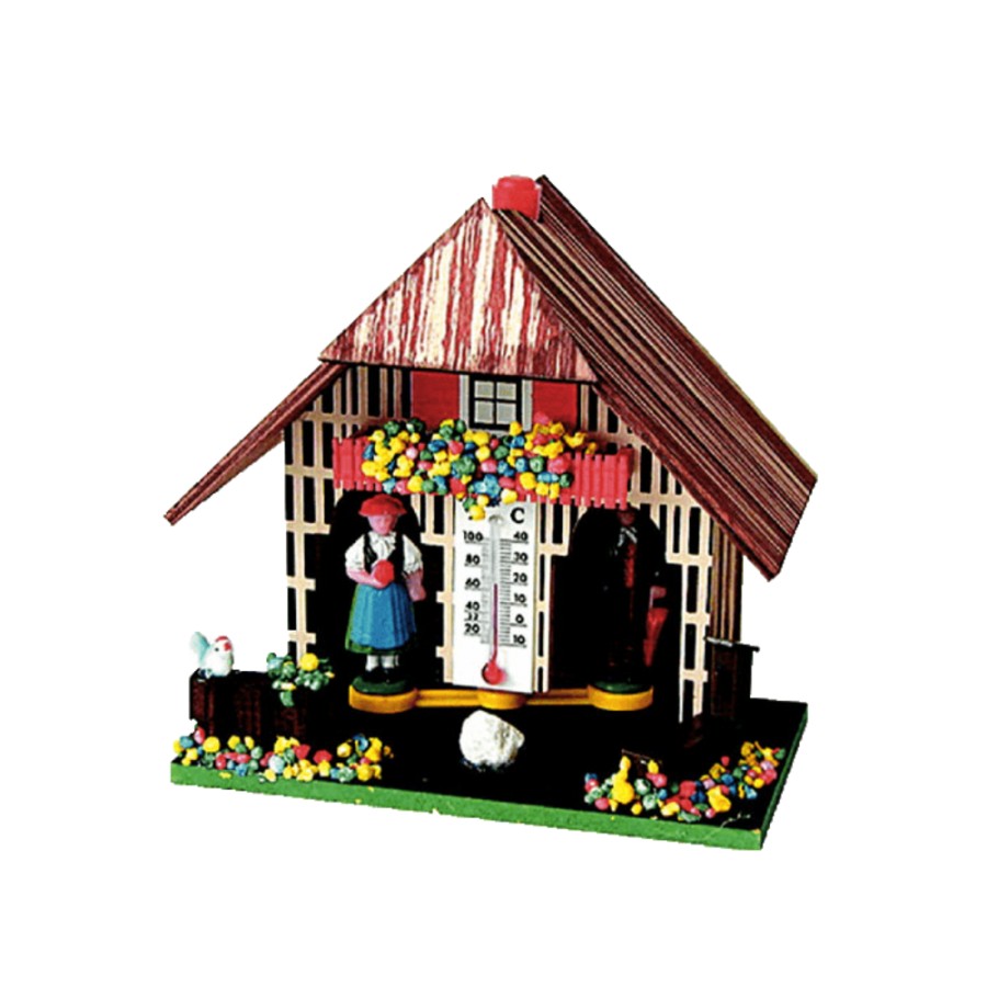 <p>Barometr s teploměrem ve tvaru pestrobarevné dřevěné chaloupky.