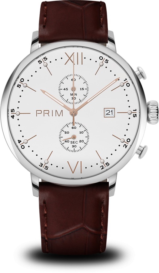 PRIM Chronoscope 25 Roman jsou elegantní a funkční hodinky s chronografem, které spojují společenský styl s minimalistickým designem. Minimalistický vzhled hodinek je navržen v typickém Bauhaus stylu s tištěnými indexy, které doplňují jemné luminiscenční prvky. Luminiscenční body na hodinových indexech a luminiscenční nátěr na hodinové a minutové ručičce zajišťují snadné čtení času i za šera. Hodinky jsou vybaveny osvědčeným japonským quartzovým strojkem OS11 a chráněny kvalitním dvojitě klenutým safírovým antireflexním sklíčkem, což dodává na jejich odolnosti a životnosti.