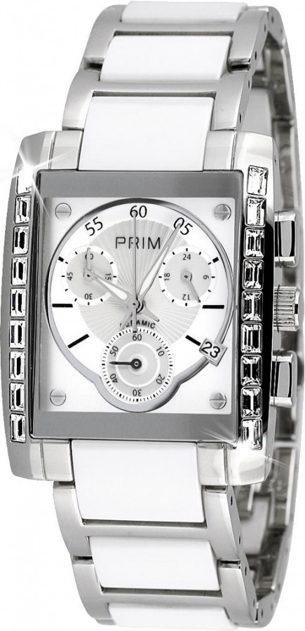 Dámský společenský chronograf vyroben z leštěné ušlechtilé nerezové oceli 316 L v kombinaci s keramikou. Do pouzdra s průměrem 30 x 38 mm je použit quartzový strojek s chronografem kalibr FS 01 s přesnosti měření na 1 sekundu. Dno je z ušlechtilé nerezové oceli 316L. Vodotěsnost 5 ATM zaručuje odolnost proti vodě při běžném použití. Po stranách pouzdra jsou vsazeny krystaly Swarovski. Pod vypouklým minerálním sklíčkem je reliéfní číselník a v okénku na pozici 4 hod. je umístěn datum. Hlavní hodinové ručky jsou pokryty luminiscenční vrstvou. Na pozici 2 hod. je umístěn čítač ve 24 hodinovém formátu času. Pro měření chronografu je na pozici 10 hod. čítač minut a sekundová ručka chronografu je centrálně umístěna spolu s hlavními. Sekundy hlavního času jsou měřeny v čítači na pozici 6 hod. Náramek je z ušlechtilé nerezové oceli 316L v kombinaci s keramikou a zapináním s dvojitou sponou tzv. "motýlkem ". Tyto hodinky jsou dodávány v luxusní krabičce se záručním listem a návodem.