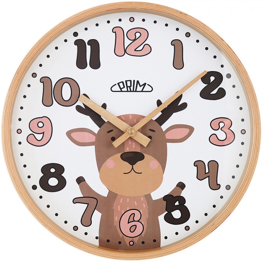 Nástěnné dětské hodiny PRIM Kalay v dřevěném provedení s motivem jelena.