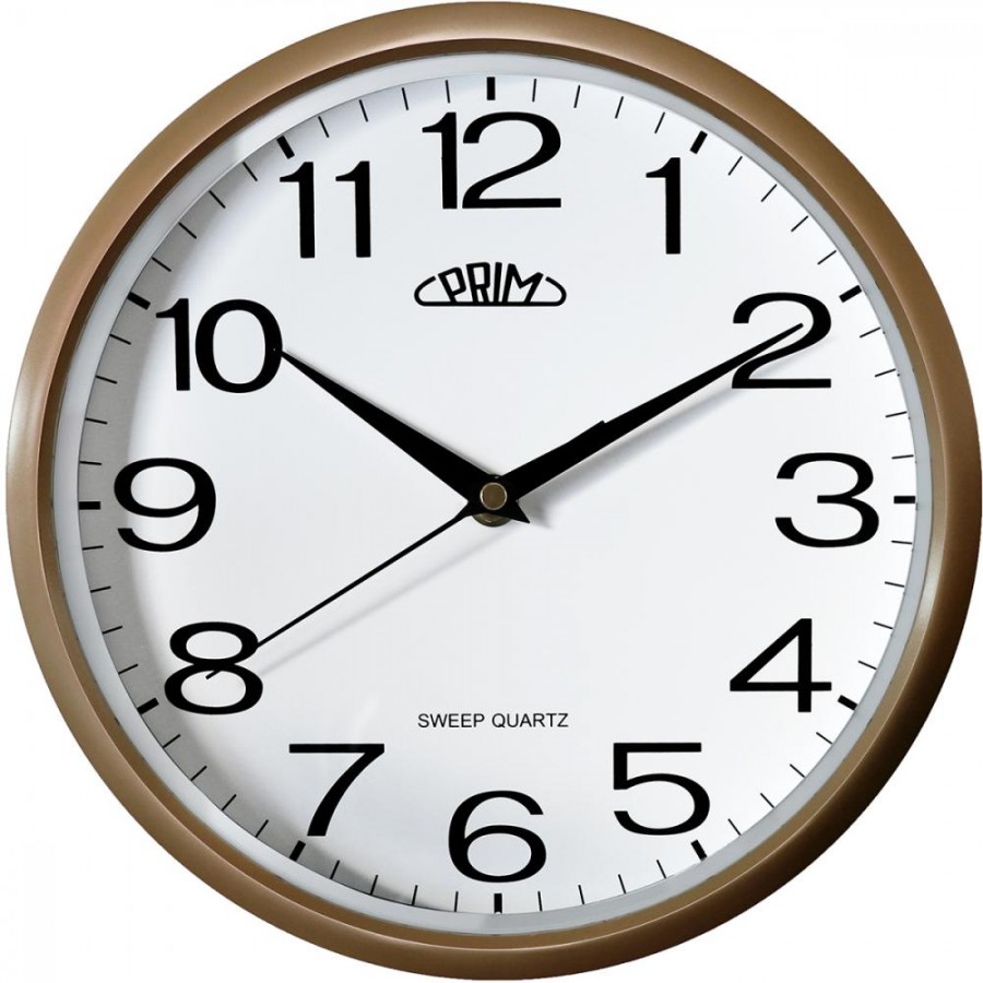 Klasické hodiny PRIM v čistém designu v plastovém provedení s arabskými číslicemi se strojkem s tichým a plynulým chodem.