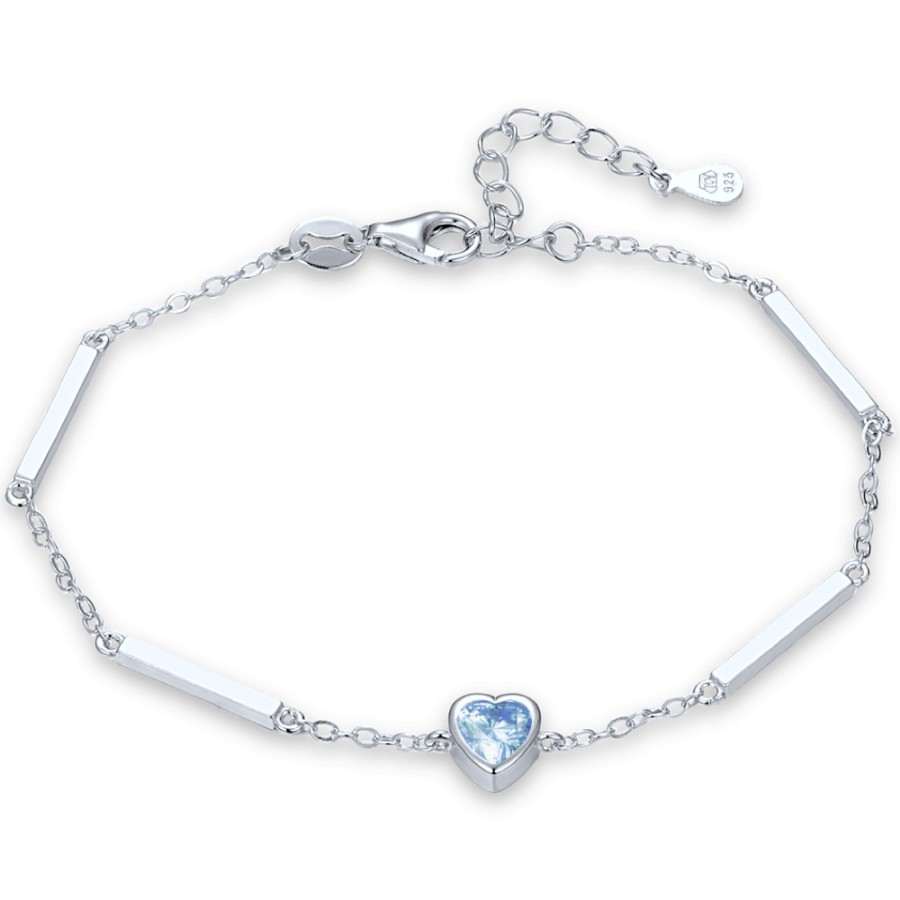 Stříbrný náramek MINET se srdcem je vyroben ze stříbra Ag 925/1000 s rhodiovaným povrchem, který pomáhá udržet jeho barvu i lesk. Světle modrý zirkon dodává jemný barevný akcent a decentní styl je vhodný pro každodenní i elegantní nošení.