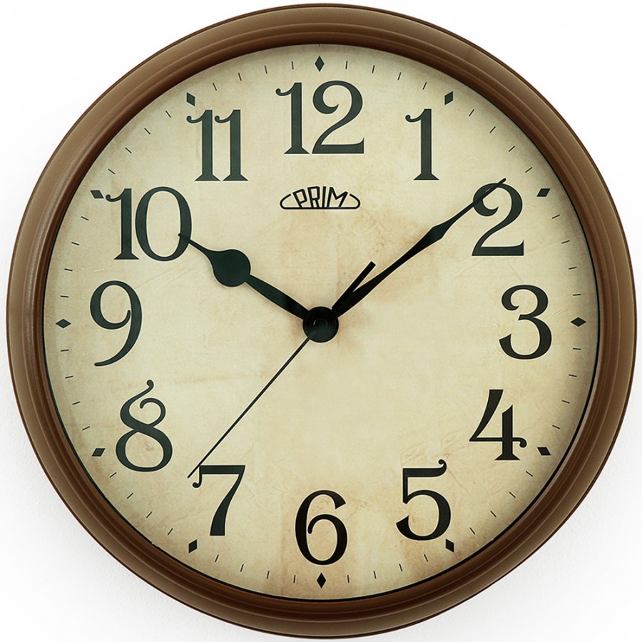 Nástěnné plastové hodiny PRIM Historic s patinovým vzorem číselníku a s elegantními retro číslicemi. Ani indexy a ručičky neunikly tomuto velmi oblíbenému designu. Uspokojí především každého, kdo má rád kousky s historickým vzhledem.