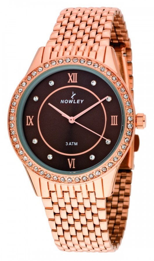 Dámské analogové hodinky NOWLEY Chic mají mosazné pouzdro růžovo-zlaté barvy posázené zirkony, minerální sklo a růžovo-zlatý ocelový tah. Quartz strojek hodinek pohání baterie. Rozměry hodinek jsou 35,8 x 35,8 x 8,3 mm a vodotěsnost 3 ATM. Funkce: Hodiny, minuty, sekundy.