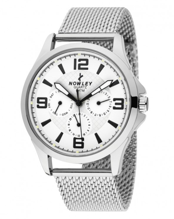 Pánské analogové hodinky NOWLEY Hot mají ocelové pouzdro, bílý ciferník, minerální sklo a ocelový tah.
