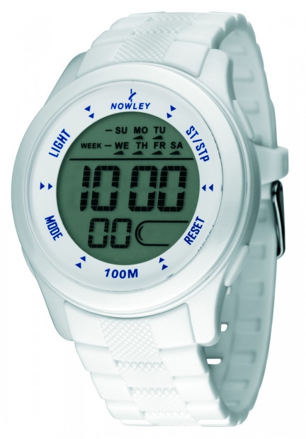 Pánské digitální hodinky NOWLEY Racing digital mají plastové pouzdro bílé barvy, minerální sklo a bílý plastový řemínek. Strojek hodinek pohání baterie. Rozměry hodinek jsou 47 x 47 x 14,8 mm a vodotěsnost 10 ATM. Funkce: Hodiny, minuty, sekundy, měsíc, datum, den v týdnu, odpočet času, budík, dva časy, stopky.