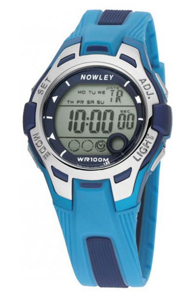 Dámské digitální hodinky NOWLEY Racing digital mají plastové pouzdro stříbrno-modré barvy, plastové sklo a modrý plastový řemínek. Strojek hodinek pohání baterie. Rozměry hodinek jsou 36,5 x 36,5 x 13,5 mm a vodotěsnost 10 ATM. Funkce: Hodiny, minuty, sekundy, měsíc, datum, den v týdnu, odpočet času, budík, dva časy, stopky.