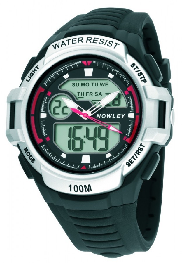 Pánské hodinky NOWLEY Racing anadigi mají plastové pouzdro, minerální sklo a černý plastový řemínek. Quartz strojek hodinek pohání baterie. Rozměry hodinek jsou 49 x 50 x 17 mm a vodotěsnost 10 ATM. Funkce: Hodiny, minuty, sekundy, měsíc, datum, den v týdnu, odpočet času, budík, dva časy, stopky.