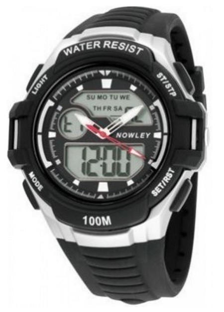 Pánské hodinky NOWLEY Racing anadigi mají plastové pouzdro, minerální sklo a černý plastový řemínek. Quartz strojek hodinek pohání baterie. Rozměry hodinek jsou 49 x 50 x 17 mm a vodotěsnost 10 ATM. Funkce: Hodiny, minuty, sekundy, měsíc, datum, den v týdnu, odpočet času, budík, dva časy, stopky.