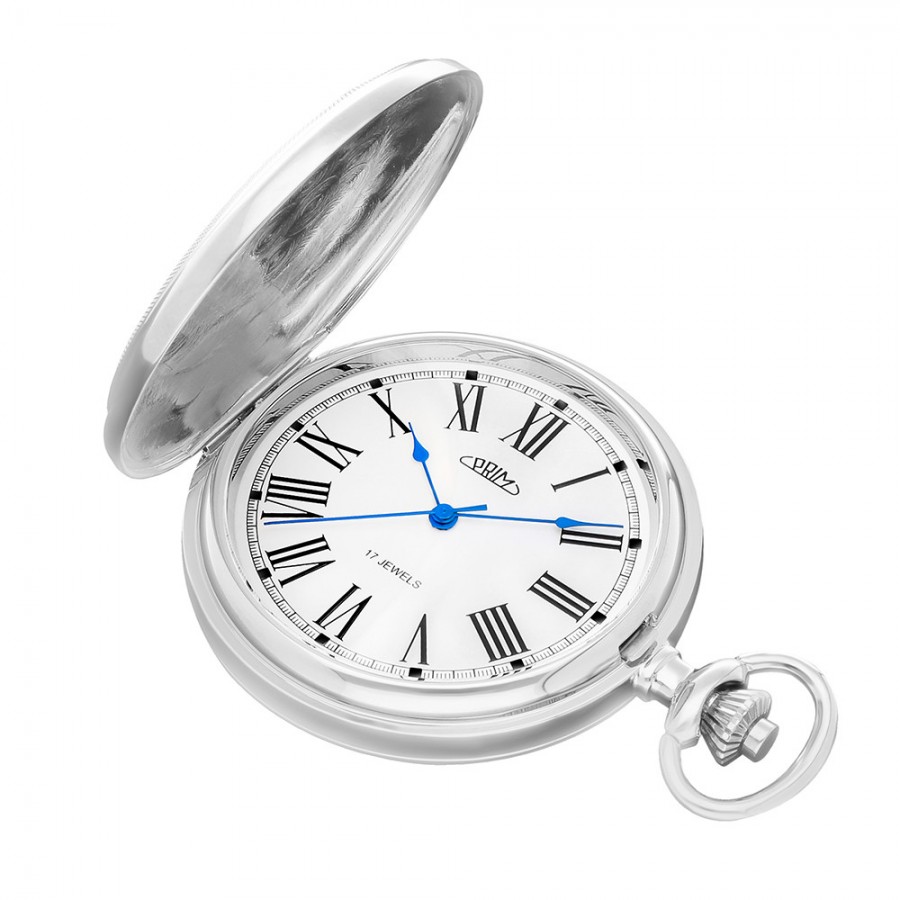 Klasické mechanické kapesní hodinky PRIM s ručním nátahem s římskymi číslicemi. Nově navržený plášť hodinek zdobí symbol českého znaku, tedy dvouocasý lev doplněný erbem, který se perfektně hodí k individualizaci monogramu. Hodinky jsou dodávány s nerezovým řetízkem.