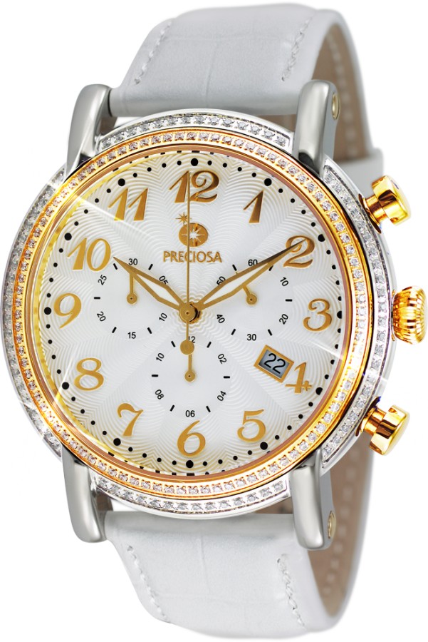 Elegantní dámské hodinky s chronografem a quartzovým strojkem. Dámské hodinky PRECIOSA. Pouzdro je vyrobeno z ušlechtilé oceli 316 L upravené leštěním do vysokého lesku. Zdobení pouzdra kubickou zirkonií PRECIOSA je provedeno CNC technologií, kdy jsou krystaly fasovány do ocelového pouzdra. Řemínek hodinek je vyroben z kvalitní kůže. 5 ATM zaručuje odolnost proti vodě při běžném užívání. Tyto hodinky jsou dodávány v luxusní krabičce se záručním listem a návodem.