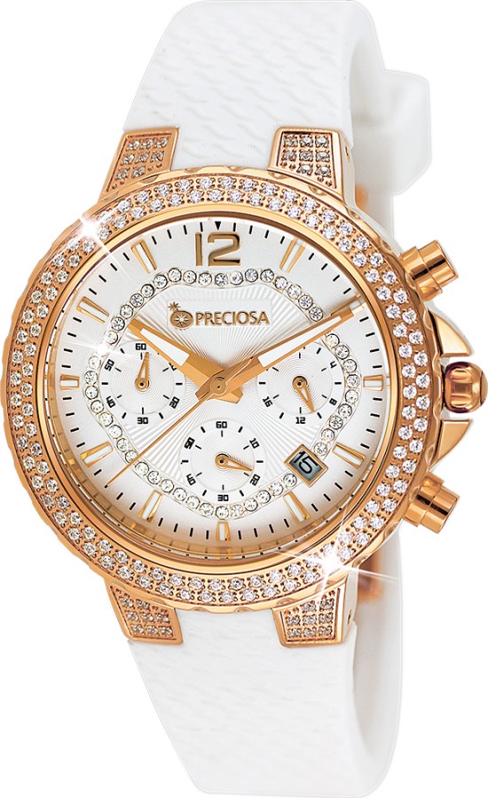 Elegantní hodinky s chronografem, duálním 24 hodinovým číselníkem a datumem. Pouzdro je vyrobeno z ušlechtilé oceli 316L upravené leštěním do vysokého lesku. Zdobení pouzdra kubickou zirkonií PRECIOSA je provedeno CNC technologií, kdy jsou krystaly fasovány do ocelového pouzdra. Netradiční vzhled dodává hodinkám silikonový řemínek. 5 ATM zaručuje odolnost proti vodě při běžném užívání. Tyto hodinky jsou dodávány v luxusní krabičce se záručním listem a návodem.