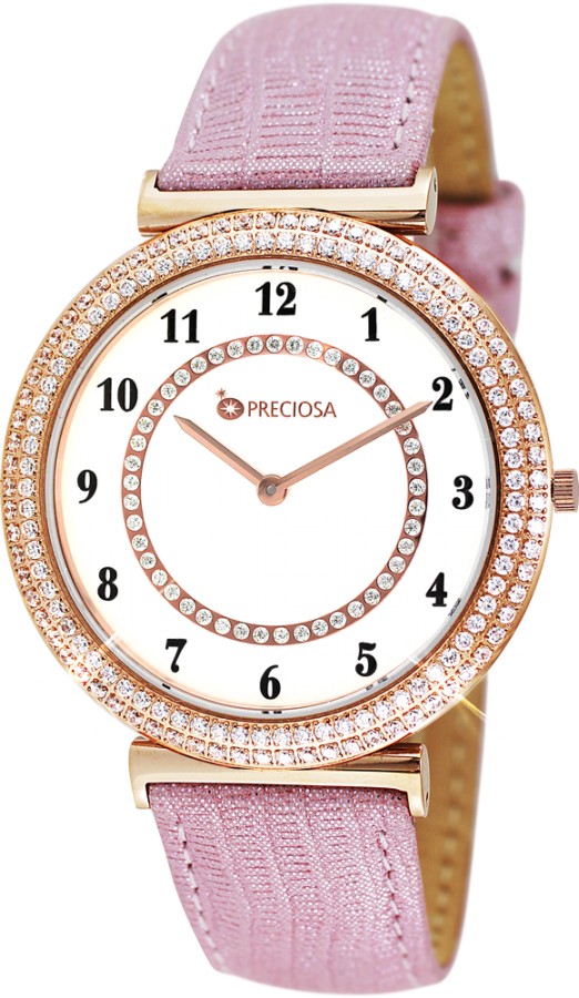 Dámské módní hodinky PRECIOSA. Pouzdro je vyrobeno z ušlechtilé oceli 316 L upravené leštěním do vysokého lesku. Zdobení pouzdra kubickou zirkonií PRECIOSA je provedeno CNC technologií, kdy jsou krystaly fasovány do ocelového pouzdra. Eleganci a šarm hodinkám dodává řemínek z kvalitní kůže. 5 ATM zaručuje odolnost proti vodě při běžném užívání. Tyto hodinky jsou dodávány v luxusní krabičce se záručním listem a návodem.