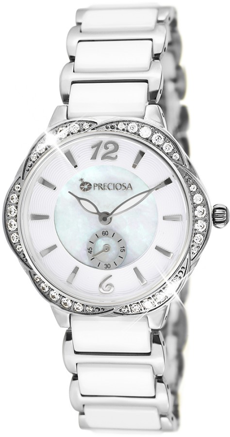 Dámské značkové hodinky PRECIOSA s vteřinovým číselníkem. Pouzdro je vyrobeno z ušlechtilé oceli 316 L upravené leštěním do vysokého lesku. Zdobení pouzdra kubickou zirkonií PRECIOSA je provedeno CNC technologií, kdy jsou krystaly fasovány do ocelového pouzdra ve tvaru květiny. Řemínek hodinek je vyroben z kombinace dvou materiálů, ušlechtilé oceli 316 L a keramiky. 5 ATM zaručuje odolnost proti vodě při běžném užívání.