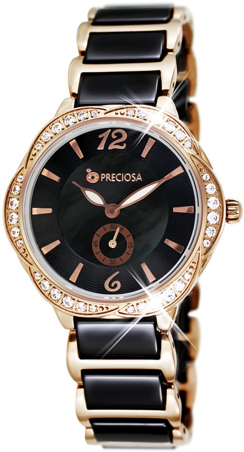 Dámské značkové hodinky PRECIOSA s vteřinovým číselníkem. Pouzdro je vyrobeno z ušlechtilé oceli 316 L upravené leštěním do vysokého lesku. Zdobení pouzdra kubickou zirkonií PRECIOSA je provedeno CNC technologií, kdy jsou krystaly fasovány do ocelového pouzdra ve tvaru květiny. Řemínek hodinek je vyroben z kombinace dvou materiálů, ušlechtilé oceli 316 L a keramiky. 5 ATM zaručuje odolnost proti vodě při běžném užívání.