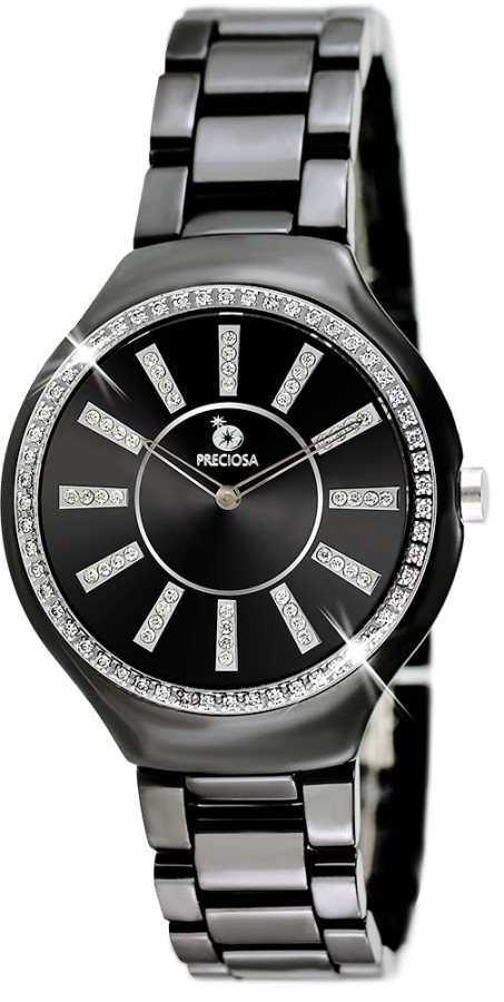 Elegantní dámské hodinky PRECIOSA. Pouzdro a tah hodinek jsou vyrobeny z keramického materiálu, který je velmi odolný proti poškrábání. Na kroužku z ušlechtilé oceli 316L jsou zafasovány krystaly PRECIOSA. Zdobení pouzdra kubickou zirkonií PRECIOSA je provedeno CNC technologií, kdy jsou krystaly fasovány do ocelového kroužku.z kombinace dvou materiálů, ušlechtilé oceli 316 L a keramiky. 5 ATM zaručuje odolnost proti vodě při běžném užívání.