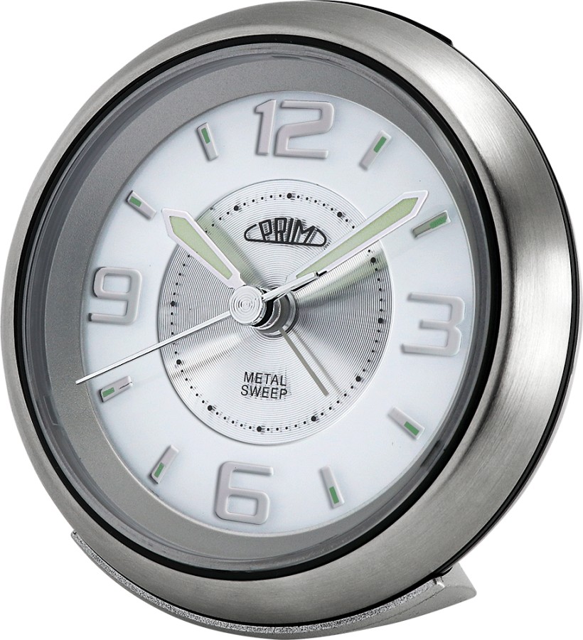 Kovový analogový budík s LED podsvícením a plynulým chodem.