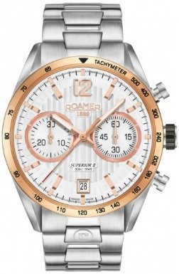 Stříbrný ciferník s ukazatelem času a datumovkou.