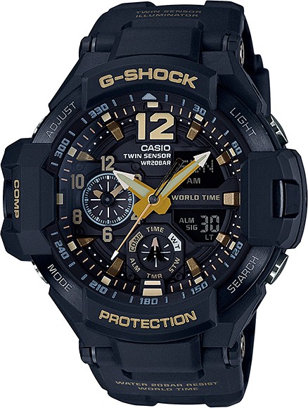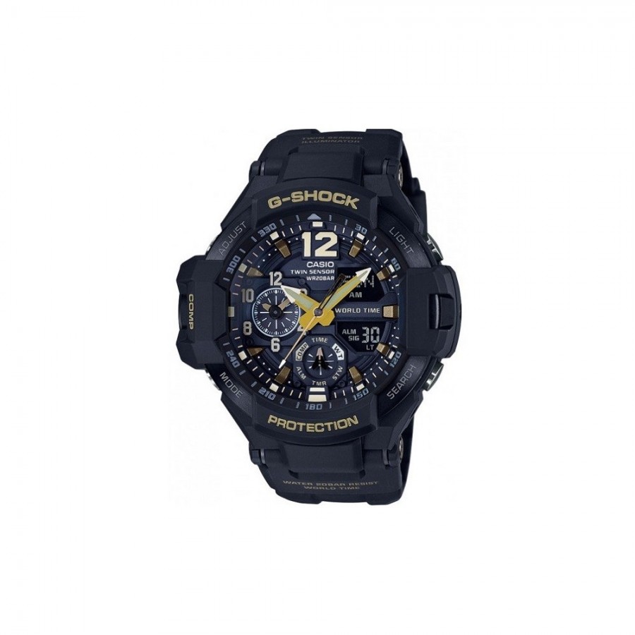 CASIO G-SHOCK Gravitymaster pánske hodinky GA-1100RG-1A - luxusné outdoorové hodinky z čiernej živice s funkciami --> dátum, 5x budík, stopky, odpočítavacie stopky, LED osvetlenie, svetové časy, plne automatický kalendár, luminiscencia, kompas, teplomer, funkcia pohyb ručičiek, tlačidlo tón on/off, vodotesnosť 200 m