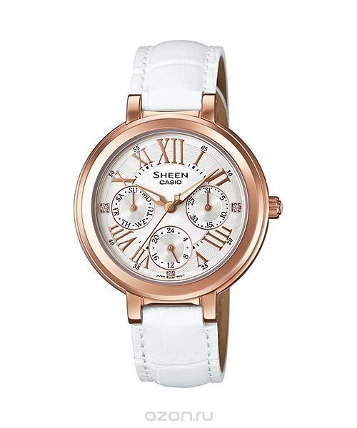 Dámske hodinky Casio Collection Sheen SHE-3034GL-7A majú po obvode kruhového oceľového puzdra ružovo pozlátenou lunetu, na striebornom číselníku nájdeme dvojitý dátum.