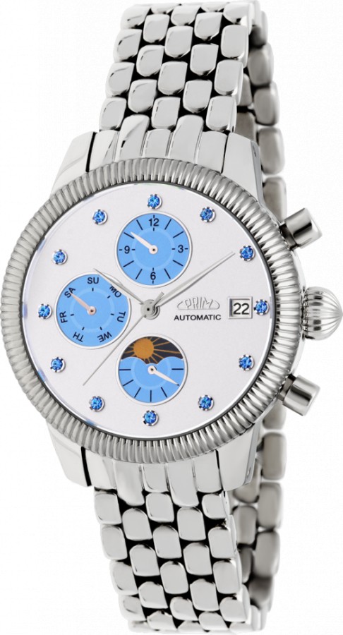 PRIM Fashion jsou dámské automatické multifunkční hodinky. Elegantní a velmi propracované pouzdro je vyrobeno z ušlechtilé nerezové oceli 316 L upravené kartáčováním,vyleštěné do vysokého lesku. Hodinky jsou uzavřené safírovým konkávním sklem, které přidává hodinkám na odolnosti. Trendy barevný či reliéfní ciferník s datumem, dnem v týdnu, měsícem a 24 hodinový číselník s fází dne a noci. Hodinky jsou uzavřené šroubovacím dýnkem s popisem hodinek. Jedná se o jemný strojek, proto je třeba dbát na šetrné zacházení. Mechanismus se natahuje automaticky z pohybů Vašeho zápěstí při běžném nošení nebo mechanickým otáčením korunky. Tyto hodinky jsou dodány v elegantní krabičce spolu se záručním listem.