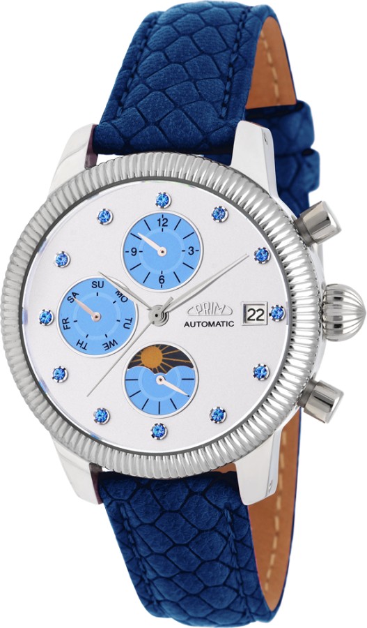 PRIM Fashion jsou dámské automatické multifunkční hodinky. Elegantní a velmi propracované pouzdro je vyrobeno z ušlechtilé nerezové oceli 316 L upravené kartáčováním,vyleštěné do vysokého lesku. Hodinky jsou uzavřené safírovým konkávním sklem, které přidává hodinkám na odolnosti. Trendy barevný či reliéfní ciferník s datumem, dnem v týdnu, měsícem a 24 hodinový číselník s fází dne a noci. Hodinky jsou uzavřené šroubovacím dýnkem s popisem hodinek. Jedná se o jemný strojek, proto je třeba dbát na šetrné zacházení. Mechanismus se natahuje automaticky z pohybů Vašeho zápěstí při běžném nošení nebo mechanickým otáčením korunky. Tyto hodinky jsou dodány v elegantní krabičce spolu se záručním listem.