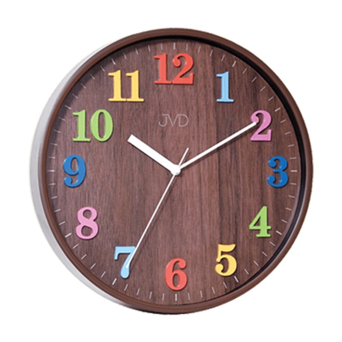 Nástěnné plastové hodiny o průměru 29,5 cm.