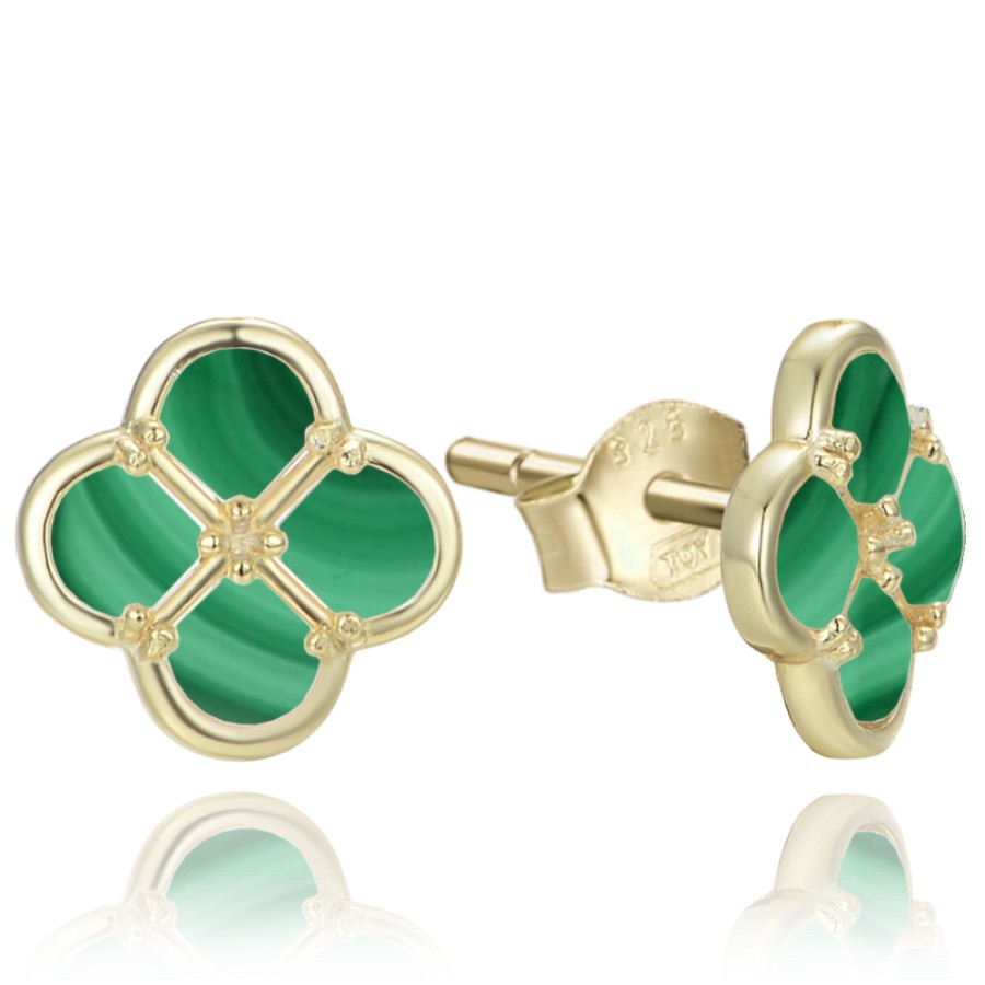 MINET Pozlacené stříbrné náušnice čtyřlístky s malachitem