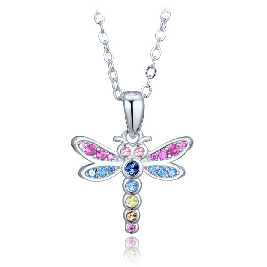 Stříbrné dětské náušnice MINET jsou vyrobeny z pravého rhodiovaného stříbra Ag 925/1000, které si dlouho udrží svou barvu i lesk. Náušnice mají motiv vážky a zdobí je růžové, modré, žluté a červené zirkony. Zapínání je řešeno patentem pro bezpečné nošení.