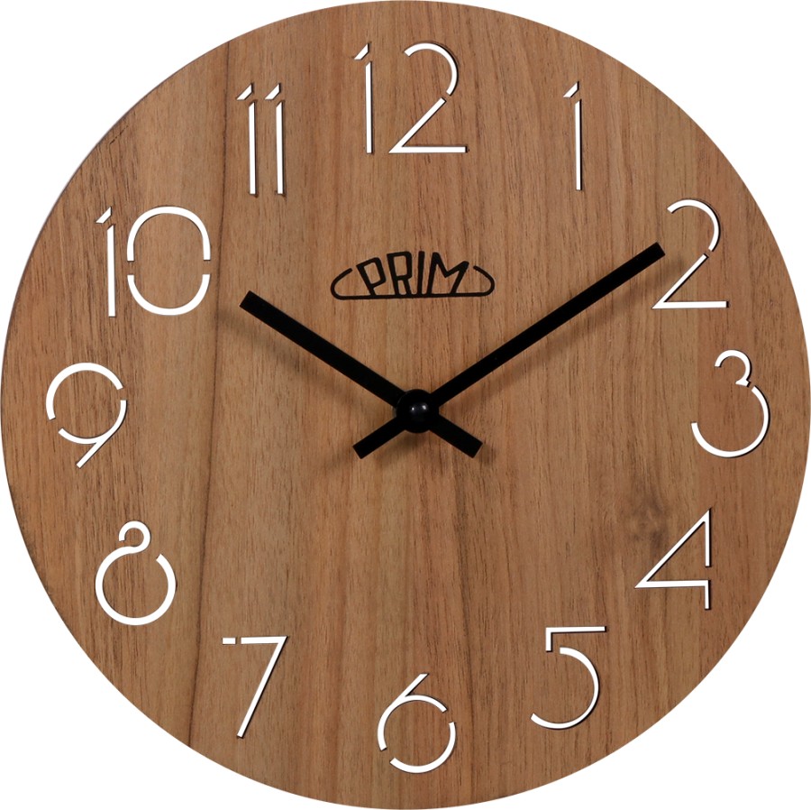 Dřevěné hodiny PRIM Natural jsou zvláštní svým osobitým vzhledem. Čísla jsou precizně vyřezány do samotného těla hodin. Baterie AA není součástí balení.