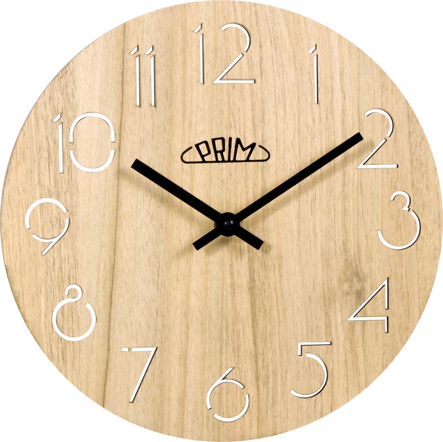 Dřevěné hodiny PRIM Natural jsou zvláštní svým osobitým vzhledem. Čísla  jsou precizně vyřezány do samotného těla hodin. Baterie AA není součástí balení.
