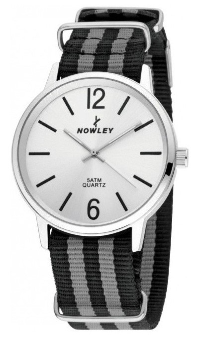 Pánske analógové hodinky NOWLEY NAVY majú mosadzné puzdro striebornej farby a biely ciferník, minerálne sklo a čierno-šedý textilný remienok. Quartz strojček hodiniek poháňa batéria. Rozmery hodiniek sú 40,2 x 40,2 x 9,1 mm a vodotesnosť 5 ATM. Funkcie: Hodiny, minúty, sekundy. Hodinky majú kvalitný čitateľný ciferník s dobre viditeľnými rúčkami. Vodotesnosť hodiniek 50M umožňuje aj povrchové plávanie vo vode.