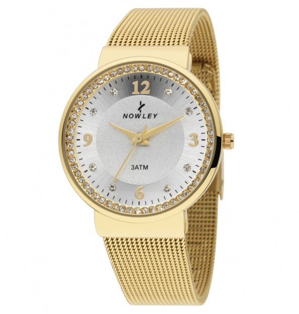 Dámske analógové hodinky NOWLEY CHIC majú mosadzné puzdro, minerálne sklo a oceľový remienok. Quartz strojček hodiniek poháňa batéria. Rozmery hodiniek sú 34,2 x 39,7 x 10 mm a vodotesnosť 3 ATM. Funkcia: Hodiny, minúty, sekundy. Hodinky majú kvalitný čitateľný ciferník s dobre viditeľnými rúčkami. Puzdro zaujme na prvý pohľad osadením trblietavými kamienkami, ktoré sa pri každom pohybe ruky oslnivo zatřpytí.