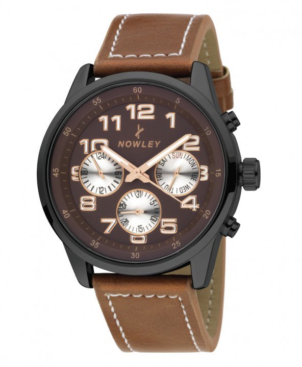 Pánske analógové hodinky NOWLEY majú mosadzné púzdro čiernej farby, minerálne sklo a kožený remienok. Quartz strojček hodiniek poháňa batérie. Priemer hodiniek je 42 mm, a vodotesnosť 5 ATM. Vlastnosti: Hodiny, minúty, sekundy, dátum, deň. Hodinky majú kvalitný čitateľný ciferník s dobre viditeľnými rúčkami. Hodinky sú multifunkčné, zobrazujú aj dátum a deň v týždni.