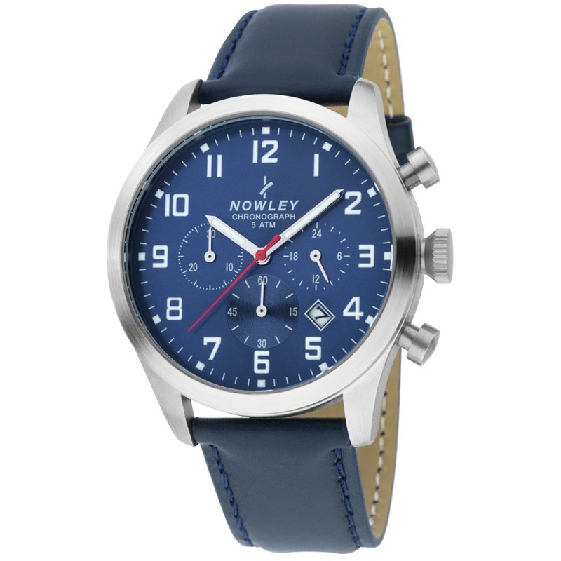 Pánske analógové hodinky NOWLEY majú mosadzné púzdro striebornej farby, minerálne sklo a kožený remienok. Quartz strojček hodiniek poháňa batérie. Priemer hodiniek je 43 mm, a vodotesnosť 5 ATM. Vlastnosti: Hodiny, minúty, sekundy, dátum, stopky. Hodinky majú kvalitný čitateľný ciferník s dobre viditeľnými rúčkami.