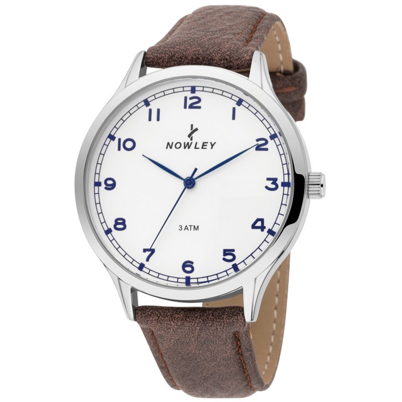 Pánske analógové hodinky NOWLEY Vintage majú mosadzné púzdro strieborné farby, minerálne sklo a kožený remienok. Quartz strojček hodiniek poháňa batérie. Priemer hodiniek je 43 mm, a vodotesnosť 3 ATM. Vlastnosti: Hodiny, minúty, sekundy.