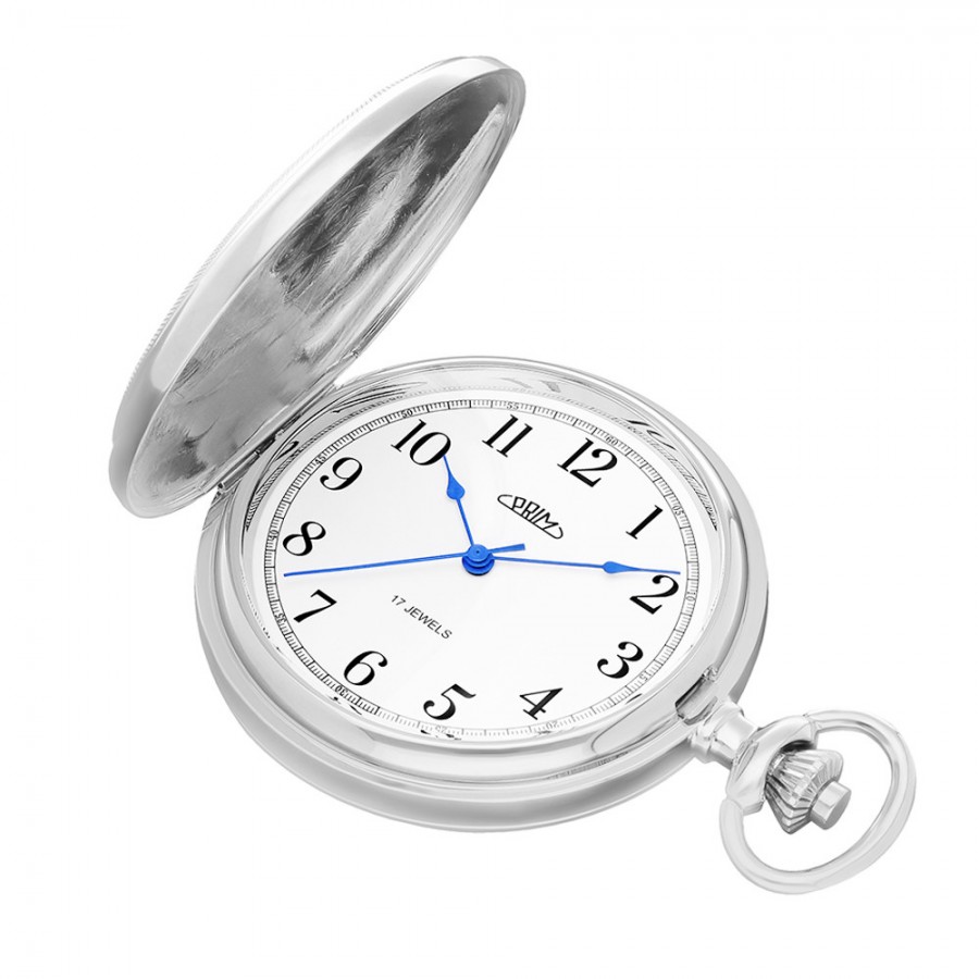 Klasické mechanické vreckové hodinky PRIM s ručným náťahom s arabskými číslicami. Novo navrhnutý plášť hodiniek zdobí symbol českého znaku, teda dvojchvostý lev doplnený erbom, ktorý sa perfektne hodí na individualizáciu monogramu. Hodinky sú dodávané s nerezovou retiazkou.